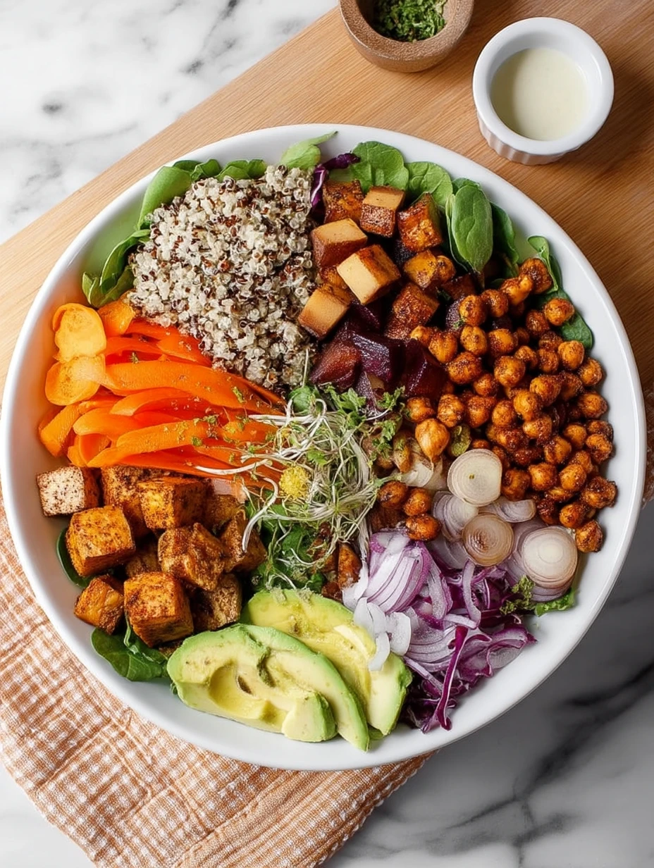 This version leans into that balance beautifully. The quinoa and chickpeas add protein, the tofu makes it even heartier, and the mix of roasted and raw vegetables keeps every forkful interesting. It is the kind of bowl that looks impressive but comes together with simple, everyday ingredients.