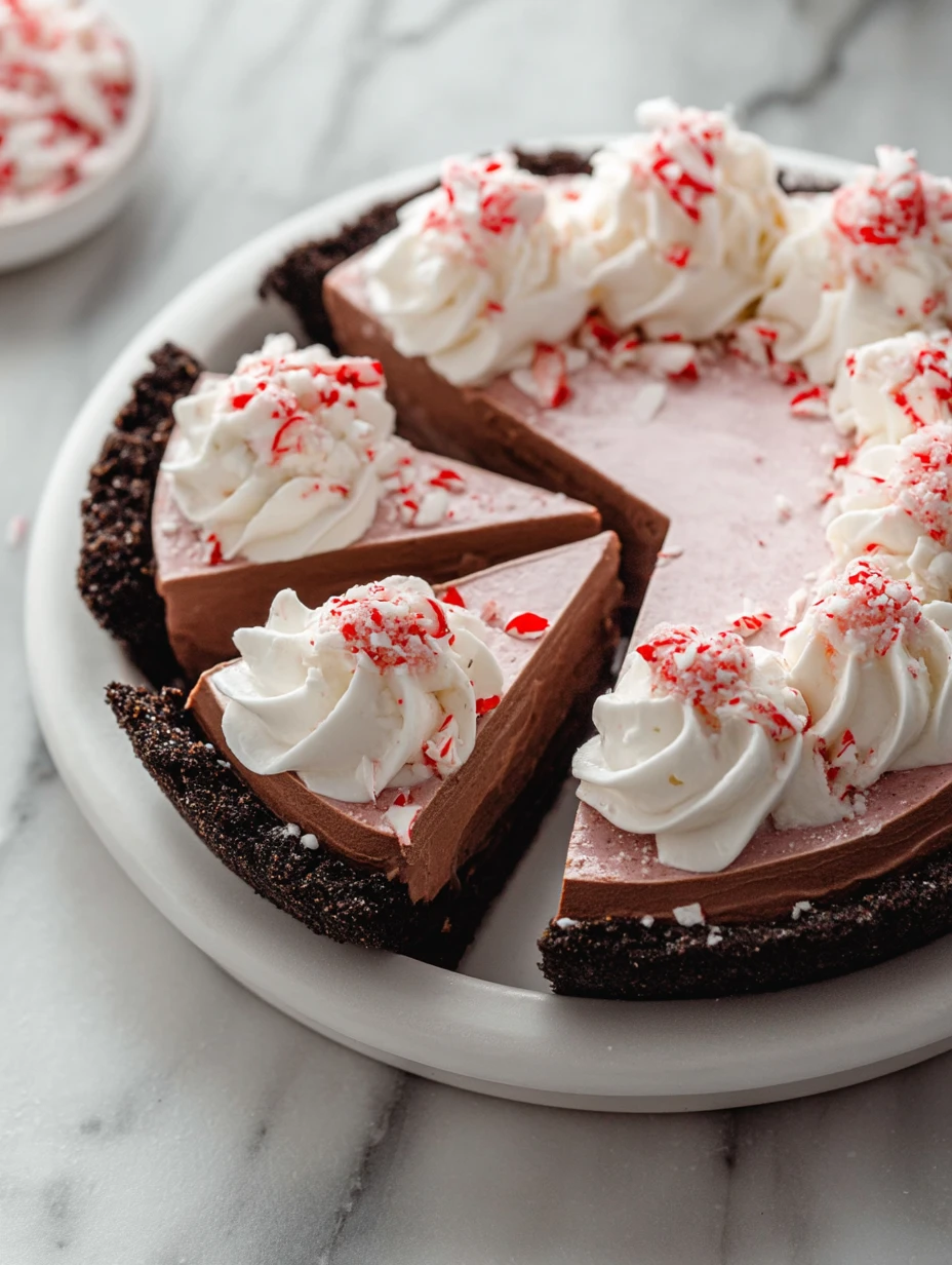 Top with piped whipped cream and crushed peppermint candies before slicing. Serve chilled.