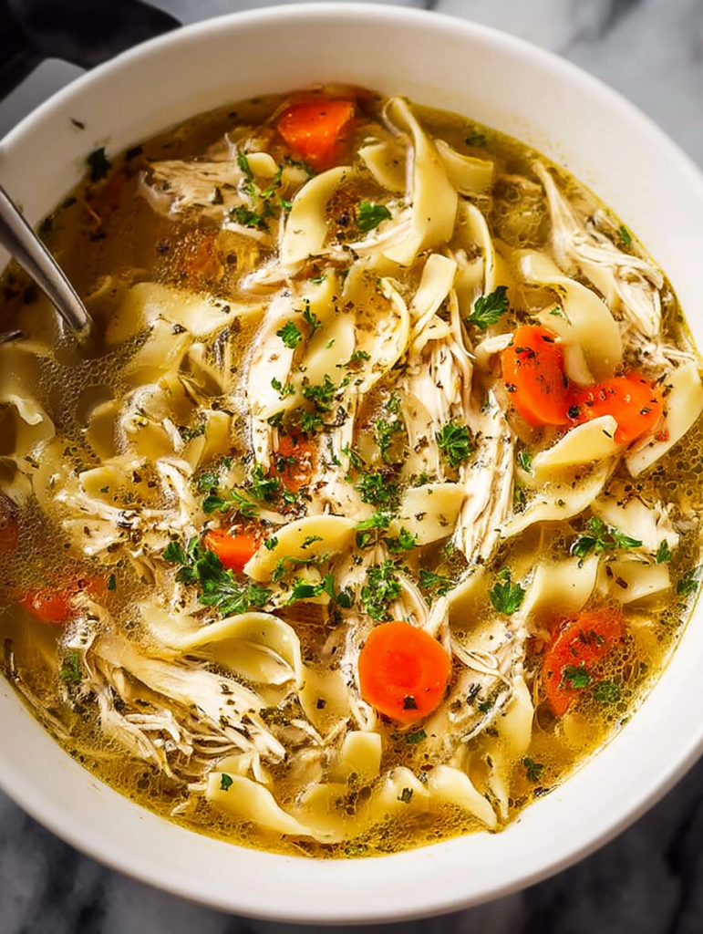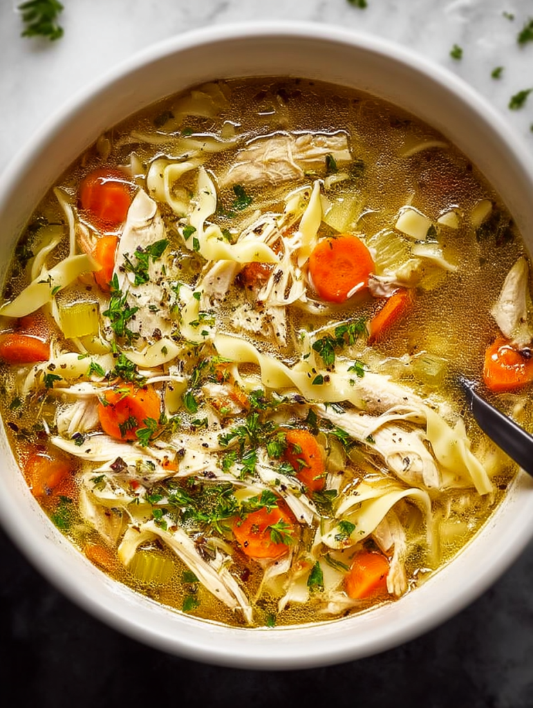 Looking for the ultimate cozy meal? This Homemade Chicken Noodle Soup delivers everything you love in one pot—comfort, flavor, and simplicity. Perfect for a quick dinner or a healthy lunch, it’s packed with tender chicken, egg noodles, and classic vegetables all simmered in a savory, herb-infused broth. Whether you’re craving comfort food, need a nourishing meal for the family, or want easy dinner ideas that store well, this recipe checks all the boxes. It’s great for meal prep, cold weather, and even healing vibes when you’re under the weather. Ideal for those searching for hearty soup ideas, healthy recipes, or easy food ideas for dinner or lunch.