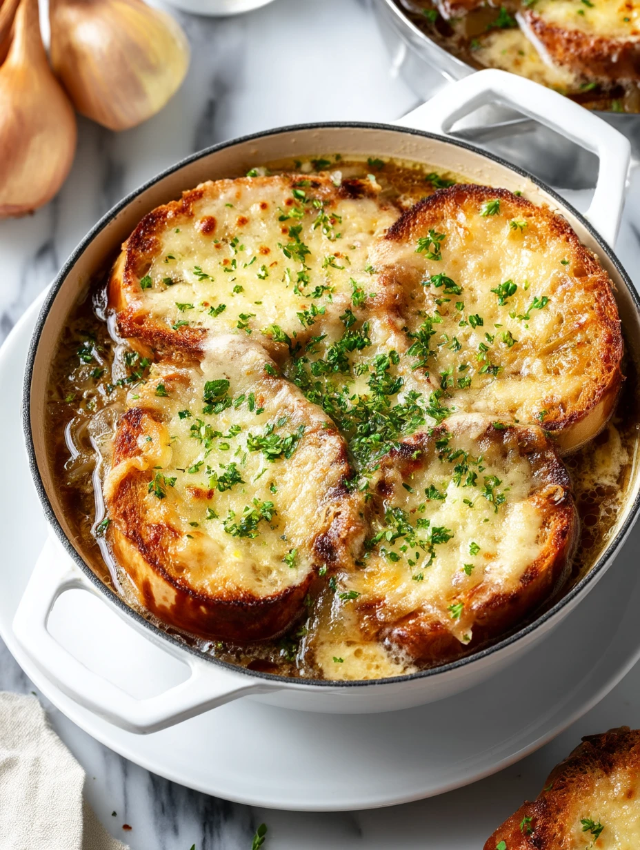 Do not rush the caramelization process. Cooking the onions slowly over medium heat develops the deep sweet flavor that defines authentic French onion soup.