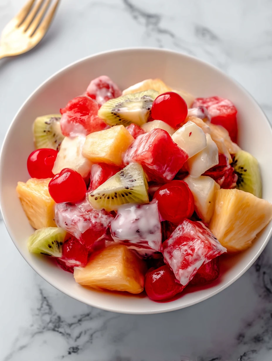 Great question! You can use both – or a combination. Canned fruit (like pineapple chunks and fruit cocktail) is super convenient and adds sweetness. Fresh fruit gives a crisp texture and can balance out the syrupy canned varieties. Just remember to drain any canned fruits really well, or your salad might turn out soupy. Fresh bananas are best added right before serving to avoid browning.