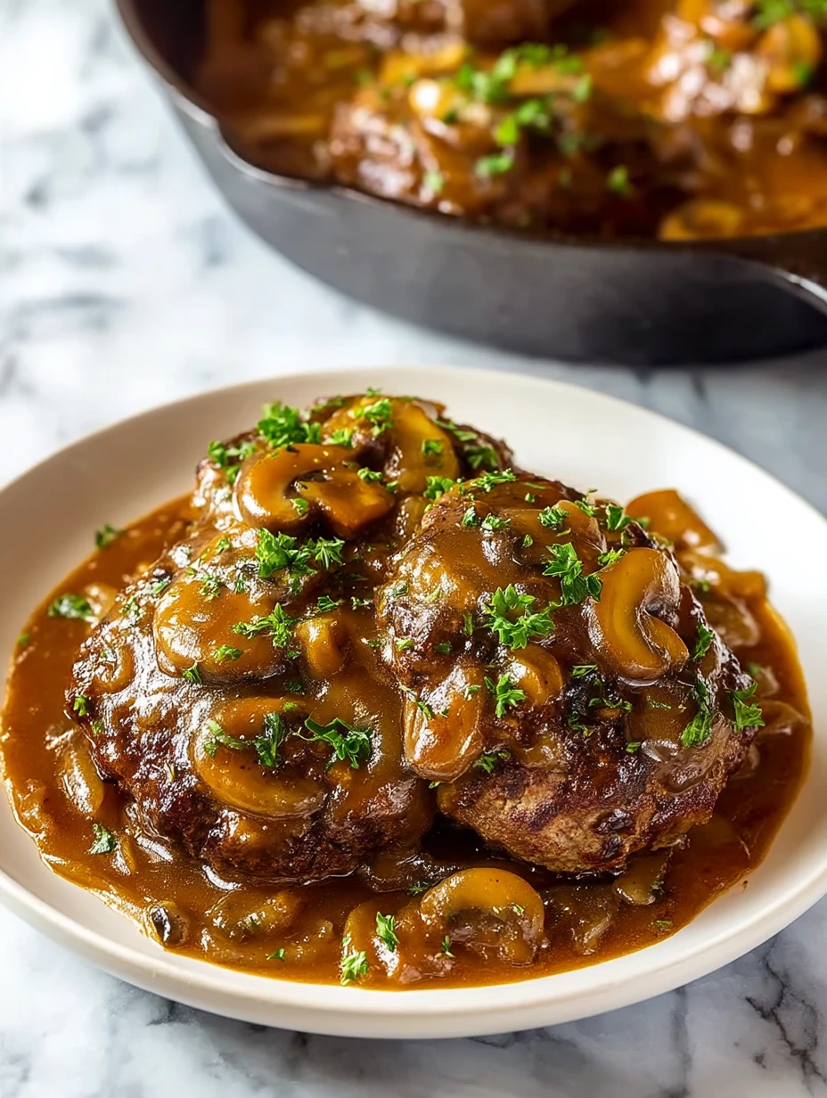 Classic comfort meets hearty flavors in this rich, saucy Homemade Salisbury Steak. This dish is everything you want on a cozy night in—juicy beef patties seared to perfection and simmered in a savory mushroom-onion gravy that coats every bite in indulgent satisfaction.