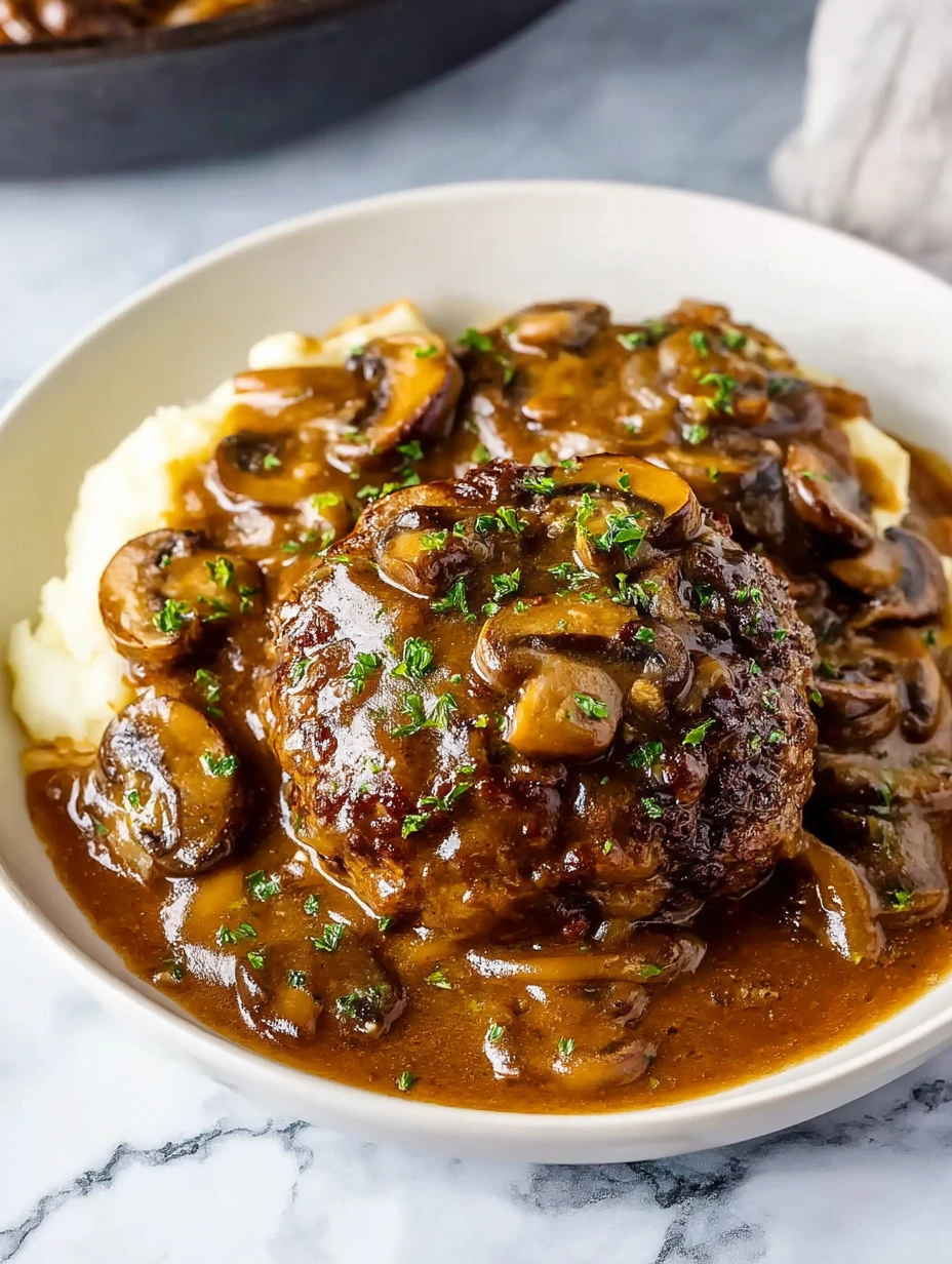 This recipe is made for flavor lovers. The seasoned ground beef patties are packed with depth from Worcestershire sauce and mustard, then smothered in a velvety gravy brimming with sautéed onions and mushrooms. It’s simple yet satisfying, and budget-friendly too!
