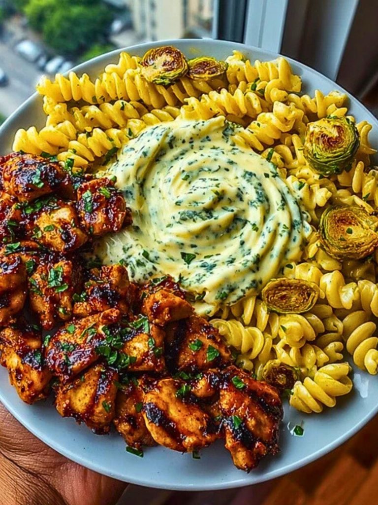 From its fiery Cajun spices to its cool, creamy feta-basil swirl, this dish is all about contrast done right. It’s not just dinner; it’s a full-on sensory experience. The sweetness of honey collides with smoky paprika and garlic, while the Alfredo keeps it all luscious. Add crispy Brussels chips on top, and suddenly you’ve got layers of flavor and texture that make this pasta feel indulgent yet exciting.