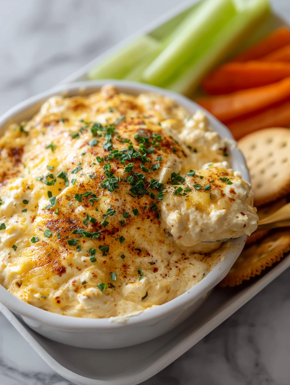 The top bakes to a beautiful golden brown, speckled with paprika and fresh chives for a punch of color and flavor. Its texture is like a cross between a creamy casserole and a thick dip, perfect for scooping with crackers, pretzels, or toasted bread. Whether you serve it hot out of the oven or let it rest into a spreadable dream, this dip never fails to steal the spotlight.
