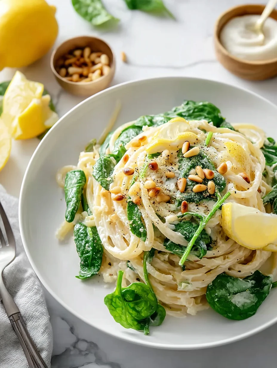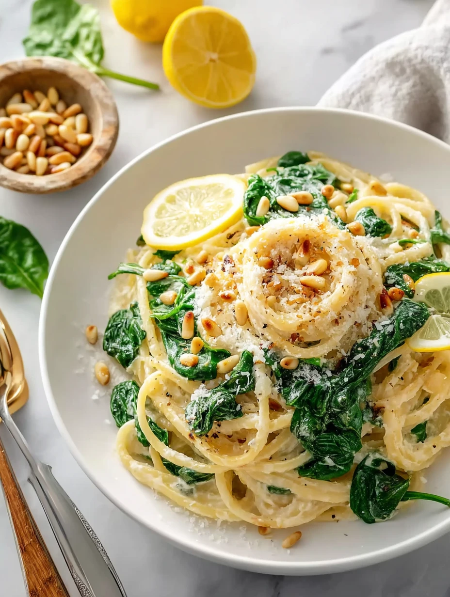 Taste the pasta and adjust the seasoning with additional salt, pepper, or lemon juice as needed. When the spinach is fully wilted and the sauce is silky, divide the pasta among serving bowls. Sprinkle each portion with the remaining Parmesan and a generous handful of toasted pine nuts. Add an extra twist of lemon zest or a pinch of red pepper flakes on top if desired.