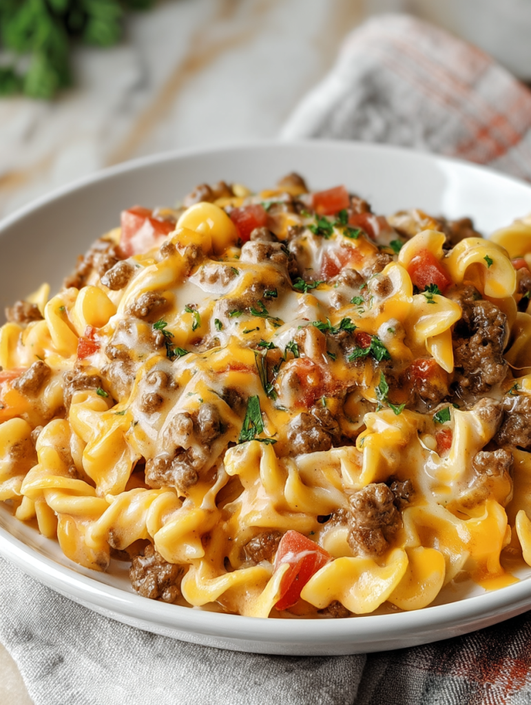 Keywords: easy dinner, cheeseburger pasta, one pot pasta, ground beef, comfort food