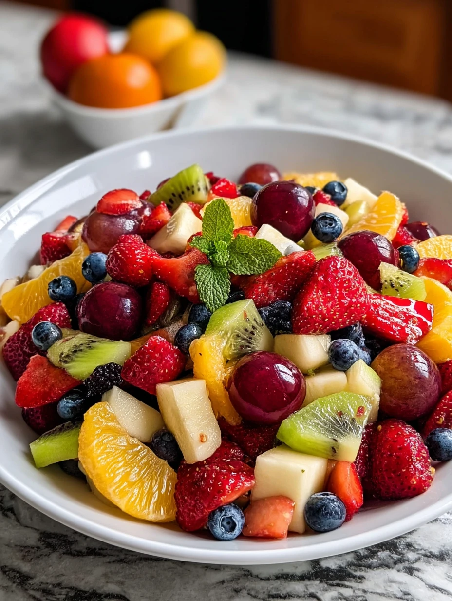 A combination of fresh berries, citrus, bananas, and a light cinnamon sprinkle makes each bite a burst of freshness with a warm holiday hint. Whether served as a light dessert, a brunch side, or even breakfast, this fruit salad will wow your guests with its festive flair and healthy appeal.
