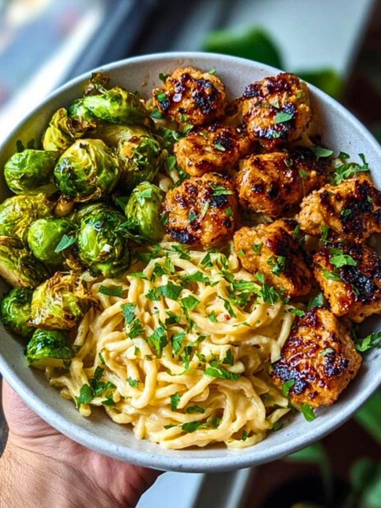 It’s a flavor explosion built for weeknight dinners or weekend indulgence. Picture this: juicy chicken bites seared to golden perfection, tossed in a sticky maple-garlic glaze, draped over a bed of creamy Cajun Alfredo pasta, and topped with roasted, crispy Brussels chips for a textural pop. Yep, it’s as outrageous as it sounds—and worth every bite.