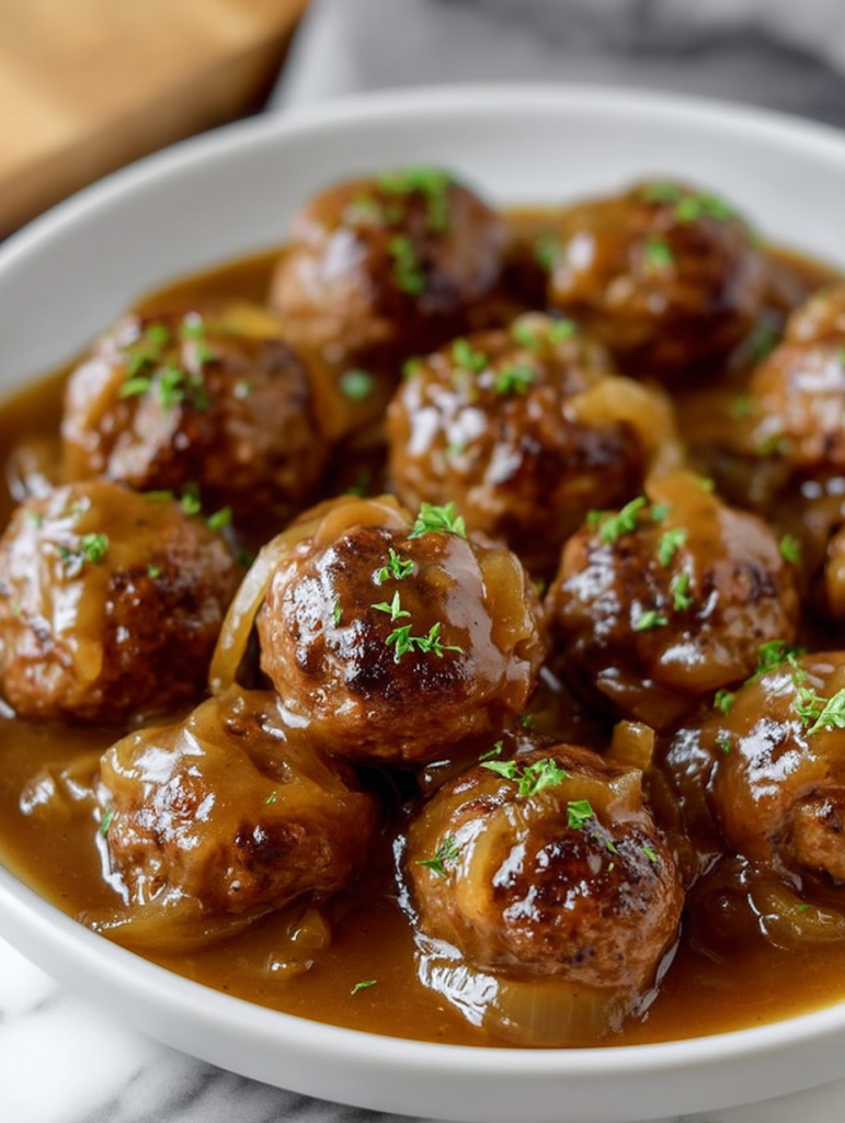 With juicy meatballs browned to perfection and then bathed in a golden-brown onion gravy, every bite feels like a warm hug. Serve it with mashed potatoes, egg noodles, or just crusty bread, and you’ve got a meal that will have everyone coming back for seconds.
