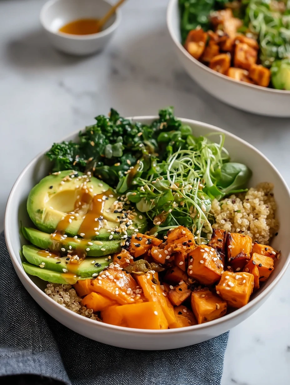 A Buddha bowl is all about balance, and this one nails it. You’ve got the sweet caramelization from roasted sweet potatoes, savory depth from the miso glaze, freshness from raw veggies, and that comforting base of quinoa.