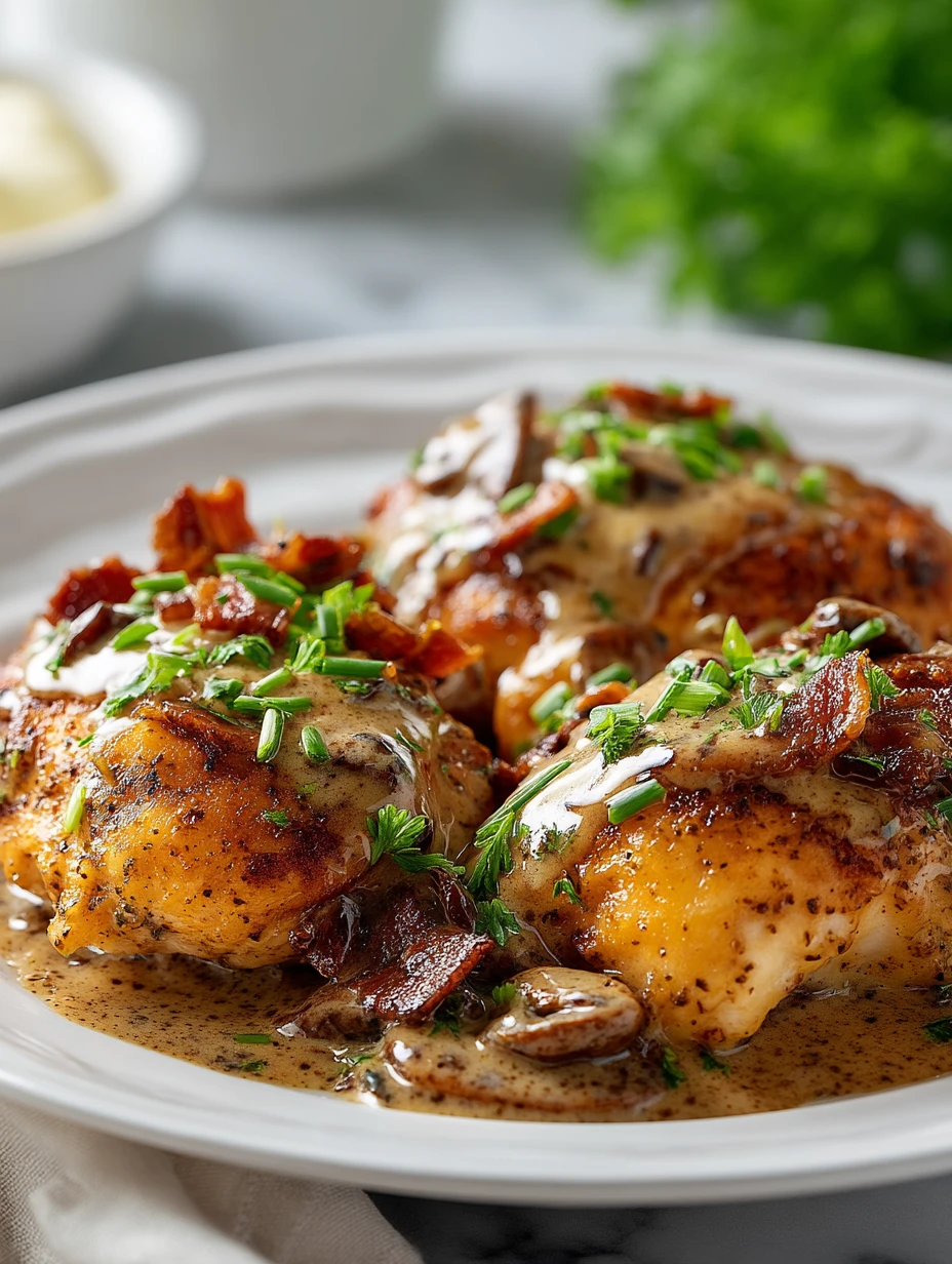 Remove the skillet from the oven and let the chicken rest for a few minutes. Top with sliced green onions just before serving. The fresh onion adds a welcome contrast to the creamy sauce and smoky bacon.