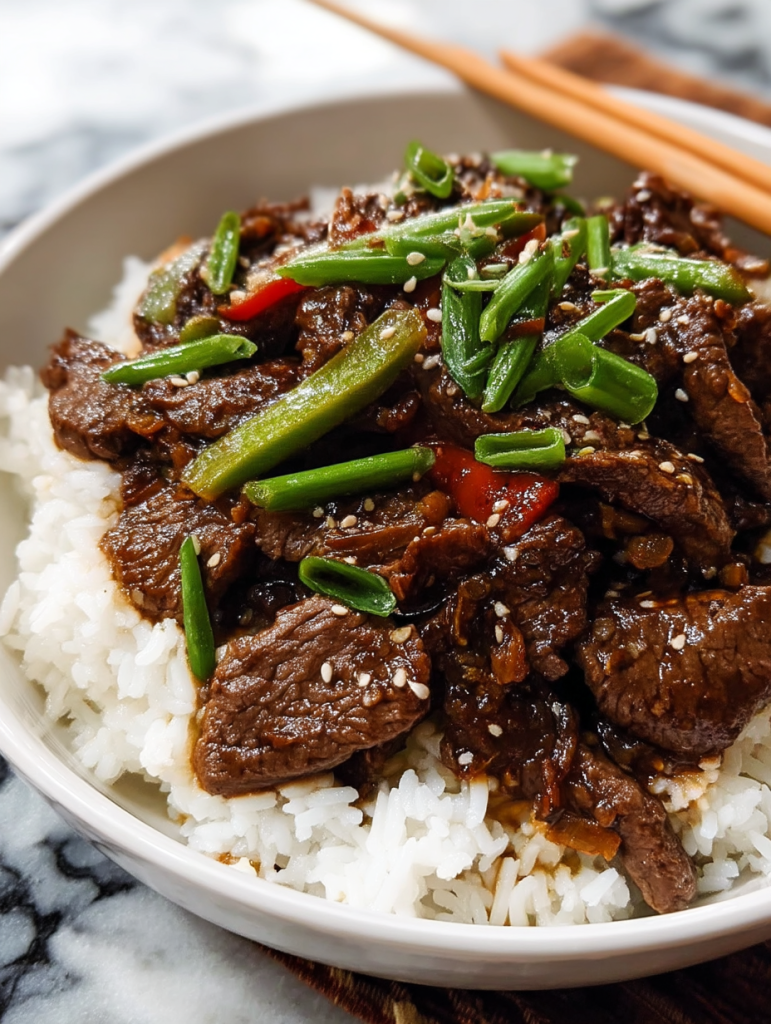 Keywords: quick beef stir fry, easy dinner, Mongolian beef, takeout at home