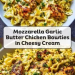 This Mozzarella Garlic Butter Chicken Bowties in Cheesy Cream is a quick, cozy, and ultra-creamy pasta dish loaded with tender golden chicken, bowtie pasta, and a cheesy garlic butter cream sauce. Ready in 30 minutes, it’s perfect for an easy dinner, crowd-pleasing weekend meal, or comfort food craving. With a balanced blend of fresh herbs, red pepper flakes, and melty mozzarella, it’s a standout recipe that checks all the boxes—easy, flavorful, and family-approved. Whether you’re searching for dinner ideas, quick meals, or pasta recipes that satisfy, this one’s a keeper.
