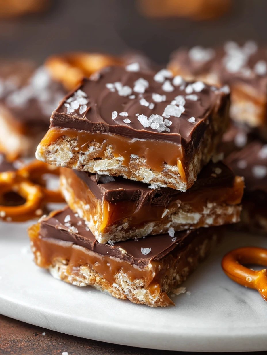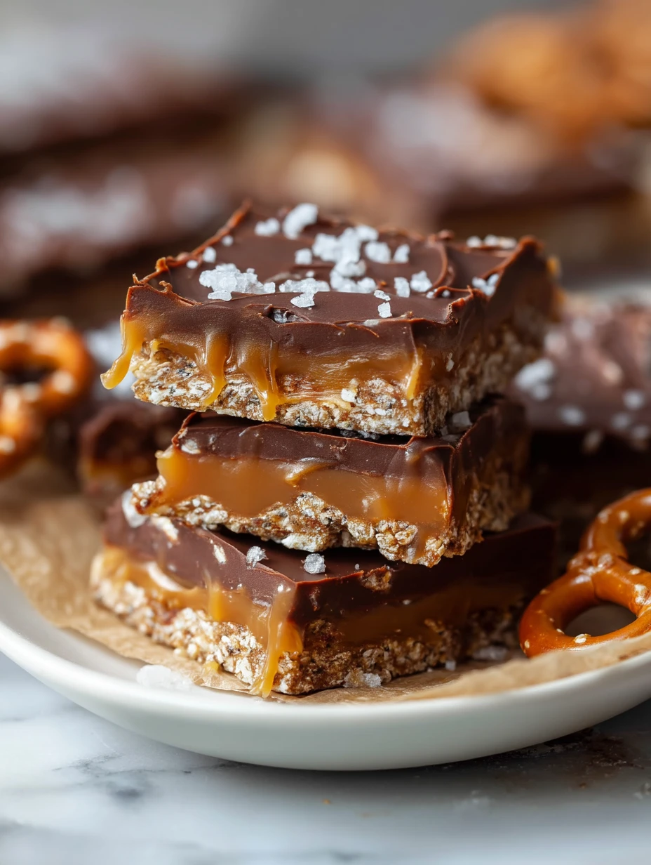 These bars are an ideal blend of effortless prep and gourmet flavor. They require minimal ingredients, no fancy tools, and absolutely no baking. The salty pretzels balance the sweet caramel and chocolate perfectly, while the flaky sea salt on top adds that sophisticated finish.