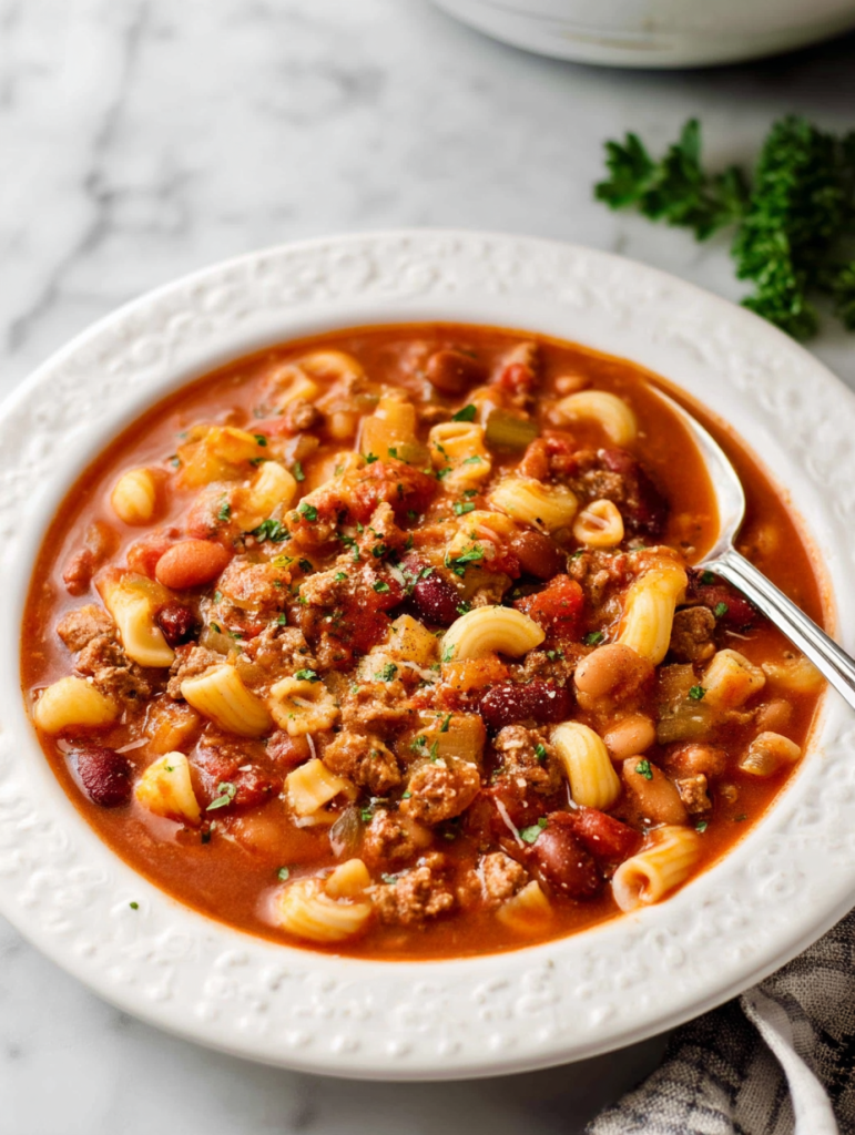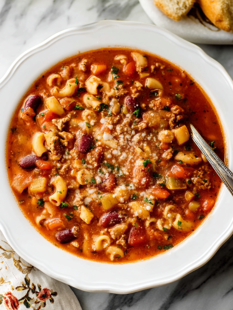 This soup delivers layers of flavor with minimal effort. The ground beef adds richness, while the combination of kidney and cannellini beans brings texture and heartiness. Ditalini pasta soaks up all the goodness from the tomato-based broth, and the herbs make every bite aromatic and satisfying.