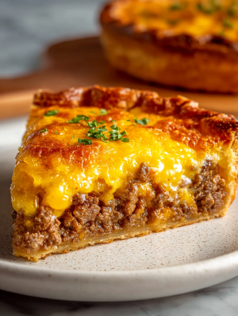 Each ingredient in this dish is chosen to replicate the comforting essence of a cheeseburger, layered into a sliceable pie format.