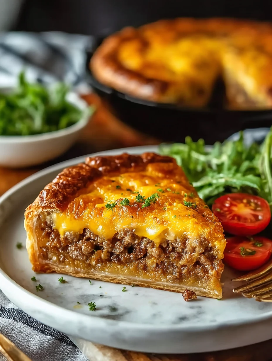 If comfort food had a crown, this One Pan Cheeseburger Pie Dinner would wear it proudly. With a golden, flaky crust and a rich, savory ground beef filling layered with melty cheddar cheese, it delivers that all-American cheeseburger flavor in a warm, shareable pie. Each bite is juicy, cheesy, and packed with flavor—perfect for busy weeknights, game days, or cozy family dinners.