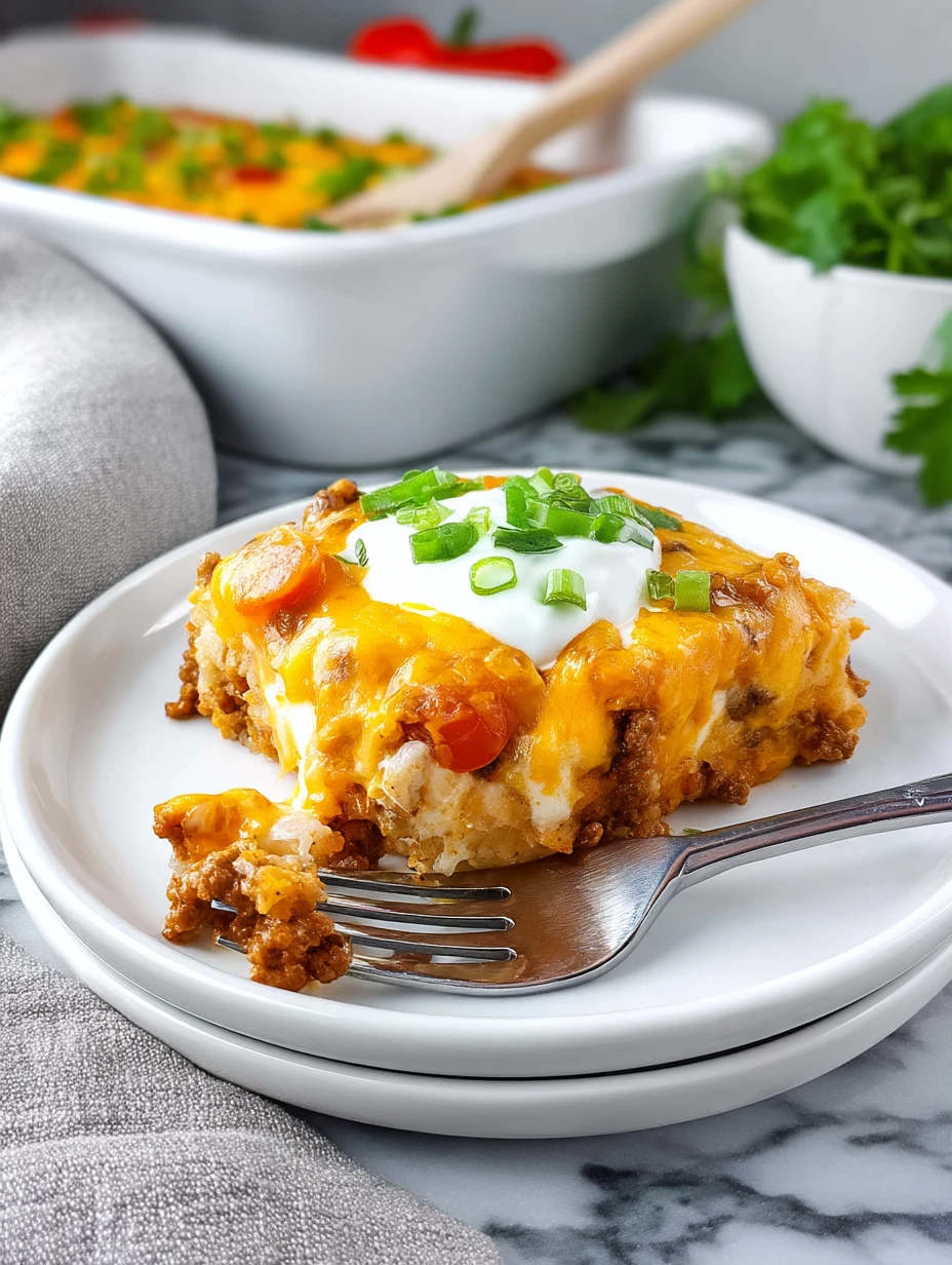 This casserole checks all the boxes for an easy dinner idea. It is rich, cheesy, filling, and packed with layers of flavor that keep each bite interesting. The seasoned beef gives it a taco-style heartiness, while the creamy topping softens the spice and ties everything together beautifully.