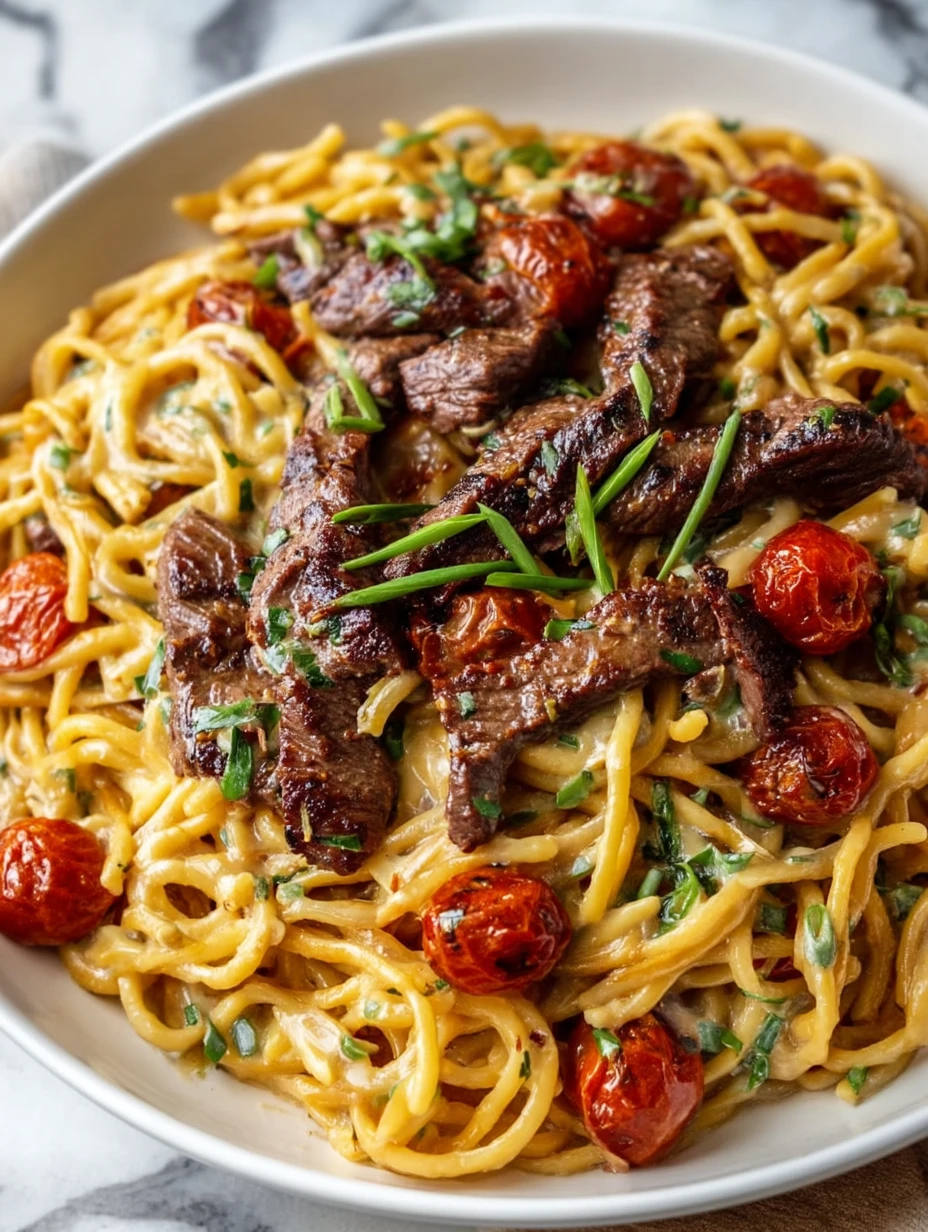 Slice your rested steak and layer it on top of the creamy pasta. Spoon a little extra sauce over everything, garnish with chopped herbs or extra chili flakes if desired.