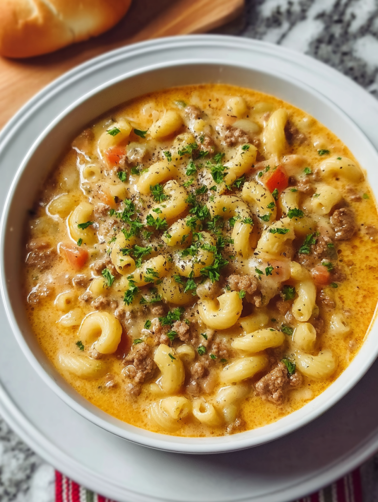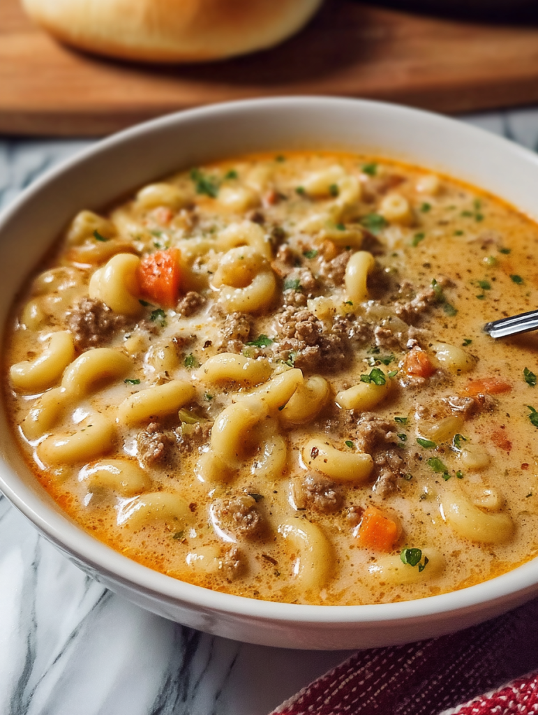 Get ready to meet your new favorite comfort food—this One-Pot Macaroni Cheeseburger Soup brings all the cozy, cheesy, beefy flavors of your favorite burger in one creamy, spoonable bowl. With ground beef, tender pasta, rich broth, and melty cheddar, it’s a family-friendly, one-pot winner that’s both hearty and easy to make. Whether you’re looking for quick dinner ideas, easy recipes for chilly nights, or just creative food ideas, this cheeseburger soup is your go-to fix. Great for weeknight meals, lazy weekends, or make-ahead freezer batches. If you love easy dinner recipes and crave something that warms you to the core—this one’s for you.