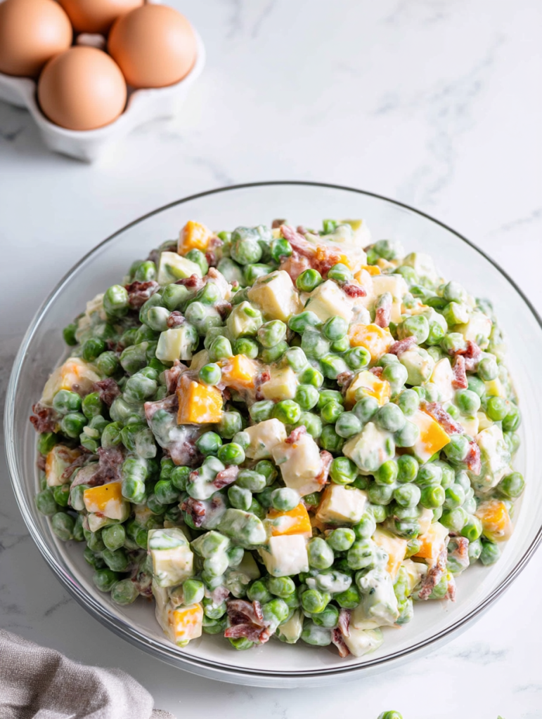 What makes this dish shine is the balance of textures and flavors. The peas offer a naturally sweet crunch, while the smoky bacon adds savory depth. Creamy dressing ties it all together, and the cheese brings richness that rounds out each bite. Plus, it takes just minutes to toss together and can be made ahead—a huge win for busy days.