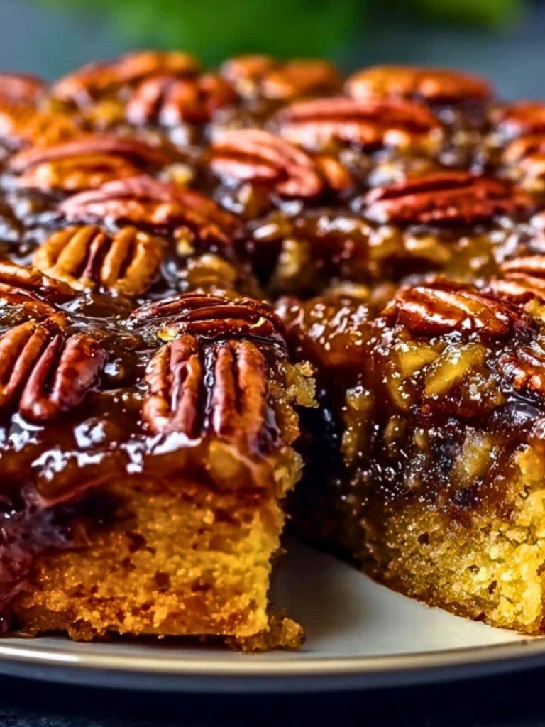 Let the cake rest for 5 minutes. Run a knife around the edge, place a serving plate over the pan, and quickly invert. Carefully lift the pan to reveal the glossy pecan top.
