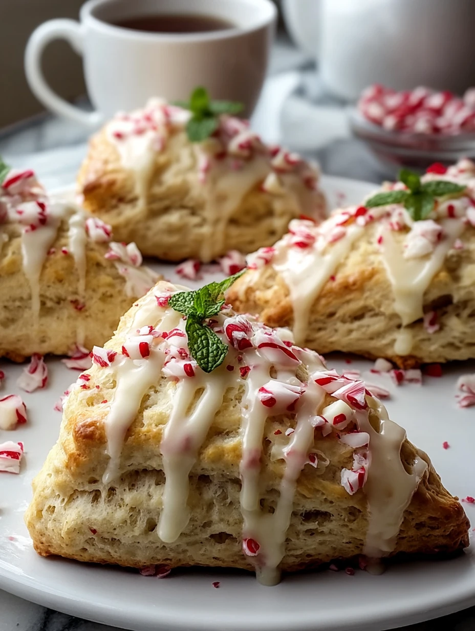 Whisk together powdered sugar and milk to make a smooth glaze. Drizzle over the warm scones and top generously with crushed peppermint.