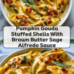 Golden, cheesy, and bursting with cozy fall flavor, these Pumpkin Gouda Stuffed Shells are comfort food with a seasonal twist. Jumbo pasta shells are filled with creamy pumpkin, rich gouda, and a hint of nutmeg, then baked in a luxurious brown butter sage Alfredo sauce. Every bite is warm, savory, and perfectly balanced.
