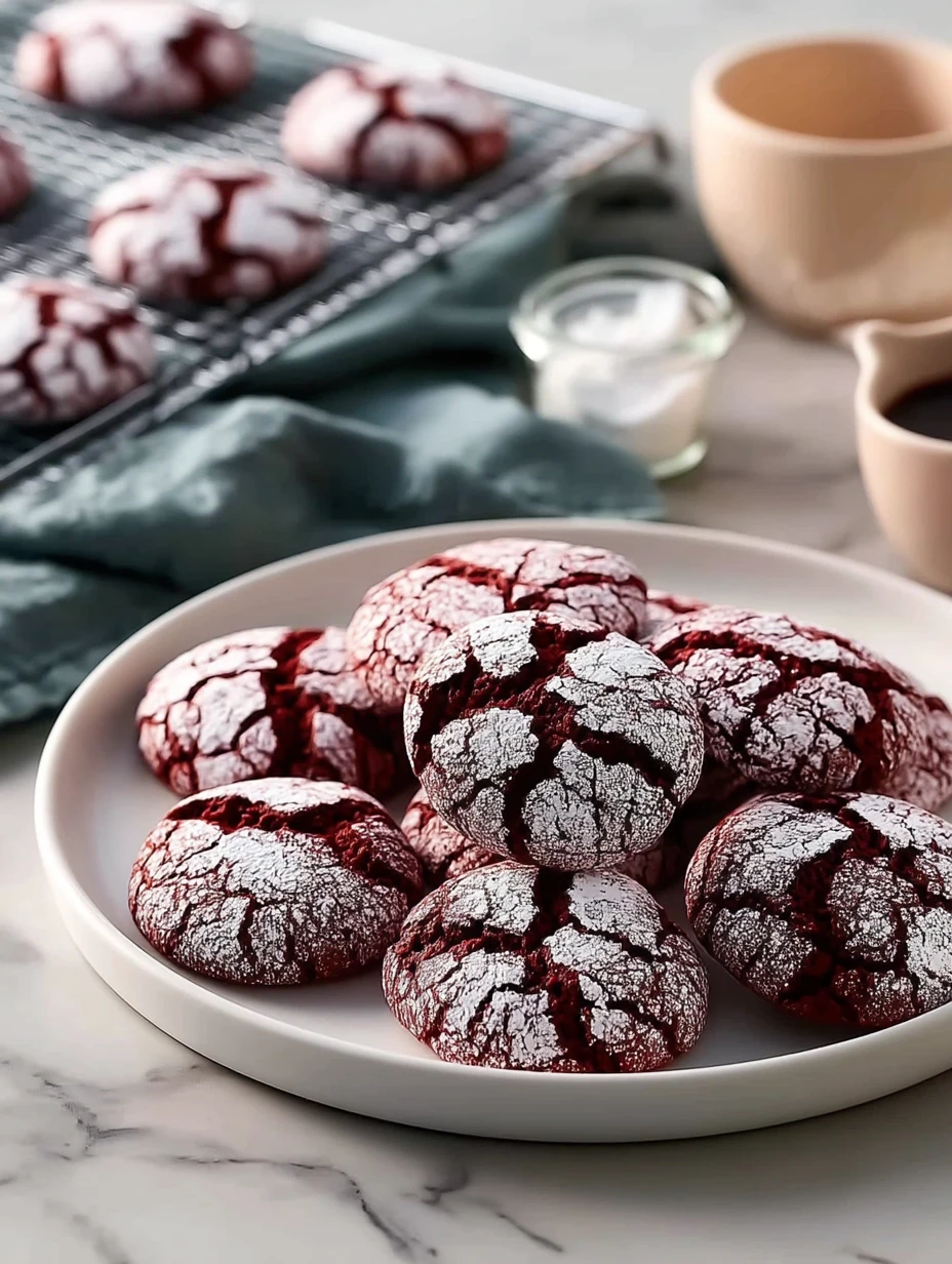What makes these cookies especially fun is their bold red color and tender texture. They have the cozy charm of classic crinkle cookies with a red velvet twist that feels festive, playful, and just a little more special when you want something eye-catching on a dessert tray.
