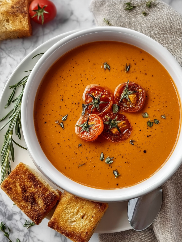 Keywords: roasted tomato soup, easy dinner, creamy soup, healthy lunch, vegetarian recipe
