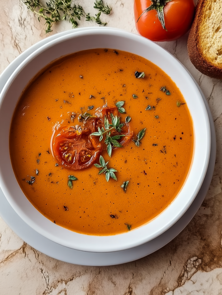 The natural sweetness of the tomatoes intensifies through roasting, while the blend of herbs like thyme and basil infuses each bite with warmth and freshness. A swirl of cream at the end gives it just enough richness, making it a soup you’ll return to again and again.