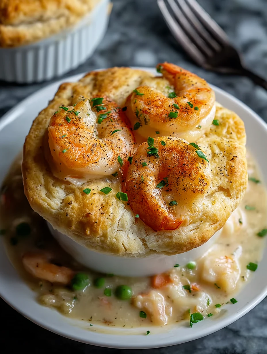 With its flaky, buttery biscuit topping and rich, savory filling, this dish turns an ordinary day into something extraordinary. The flavors are layered with garlic, cream, seafood stock, and herbs, delivering a luxurious pot pie that doesn’t need a special occasion to be served.
