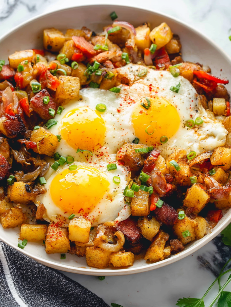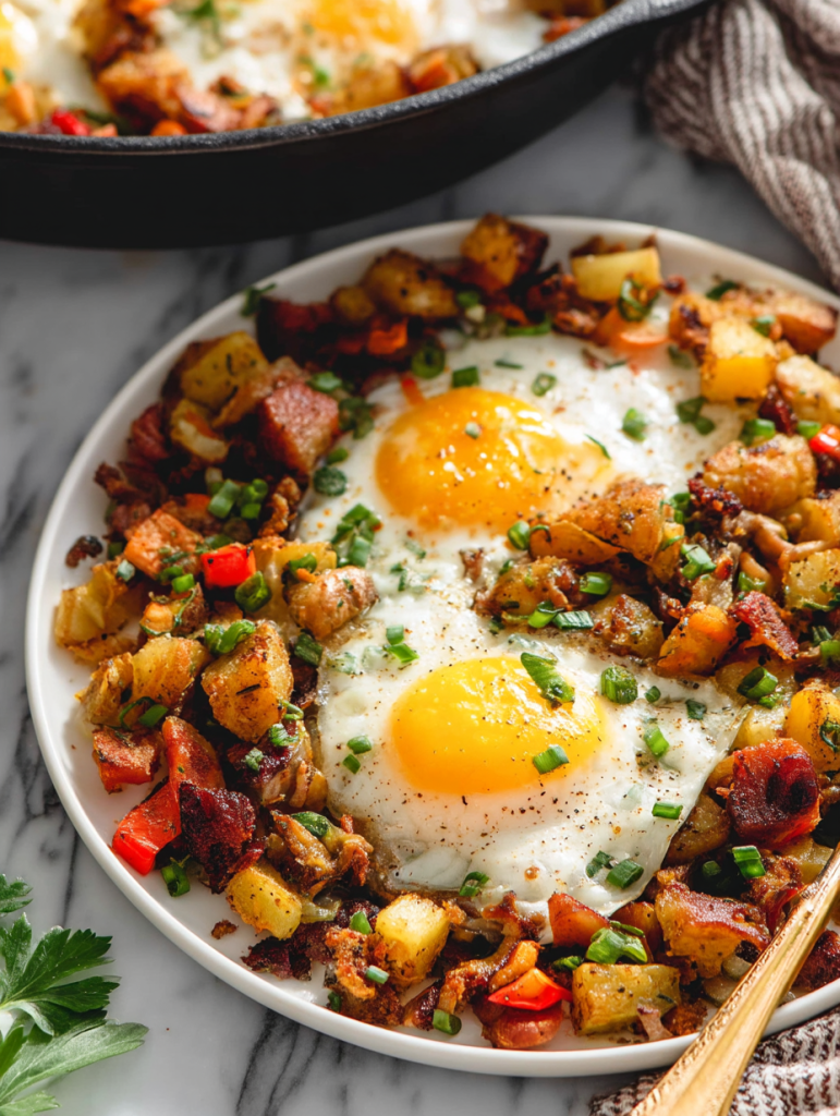 Wake up to the ultimate comfort food with this Skillet Breakfast Hash—a one-pan wonder packed with golden crispy potatoes, savory sausage, melty cheddar cheese, and eggs with perfectly runny yolks. It’s a hearty, crowd-pleasing dish that’s quick enough for weekday mornings but special enough for weekend brunch. Whether you’re searching for breakfast ideas, easy recipes, or food ideas to please a hungry crowd, this easy recipe checks all the boxes for flavor, ease, and satisfaction. Ideal for quick breakfast lovers and healthy snack seekers who love a savory start to the day.