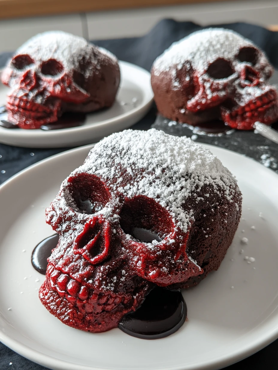 Rich, dramatic, and absolutely unforgettable—Skull Lava Cakes are the show-stopping dessert you didn’t know you needed. These individual red velvet skulls are filled with molten chocolate lava, creating an eerie but decadent effect when sliced. With a hauntingly beautiful powdered sugar glaze and rich cocoa-red crumb, they’re a spooky treat for Halloween parties or any gothic-themed gathering.