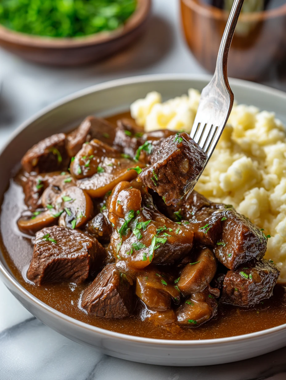 Chuck roast, stew meat, or sirloin tips are all excellent choices for this recipe. Chuck roast is especially popular because it becomes fork-tender and richly flavorful after hours of simmering in gravy. Choose well-marbled cuts for the juiciest, most satisfying bites.