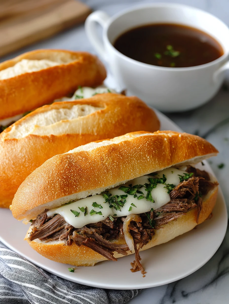 When it’s time to eat, you pile that juicy shredded beef onto toasted rolls, top it with melty provolone, and serve it with a warm cup of au jus for dipping. It’s cozy, satisfying, and feels like something you’d order at a little neighborhood diner—only you made it at home with almost no effort.