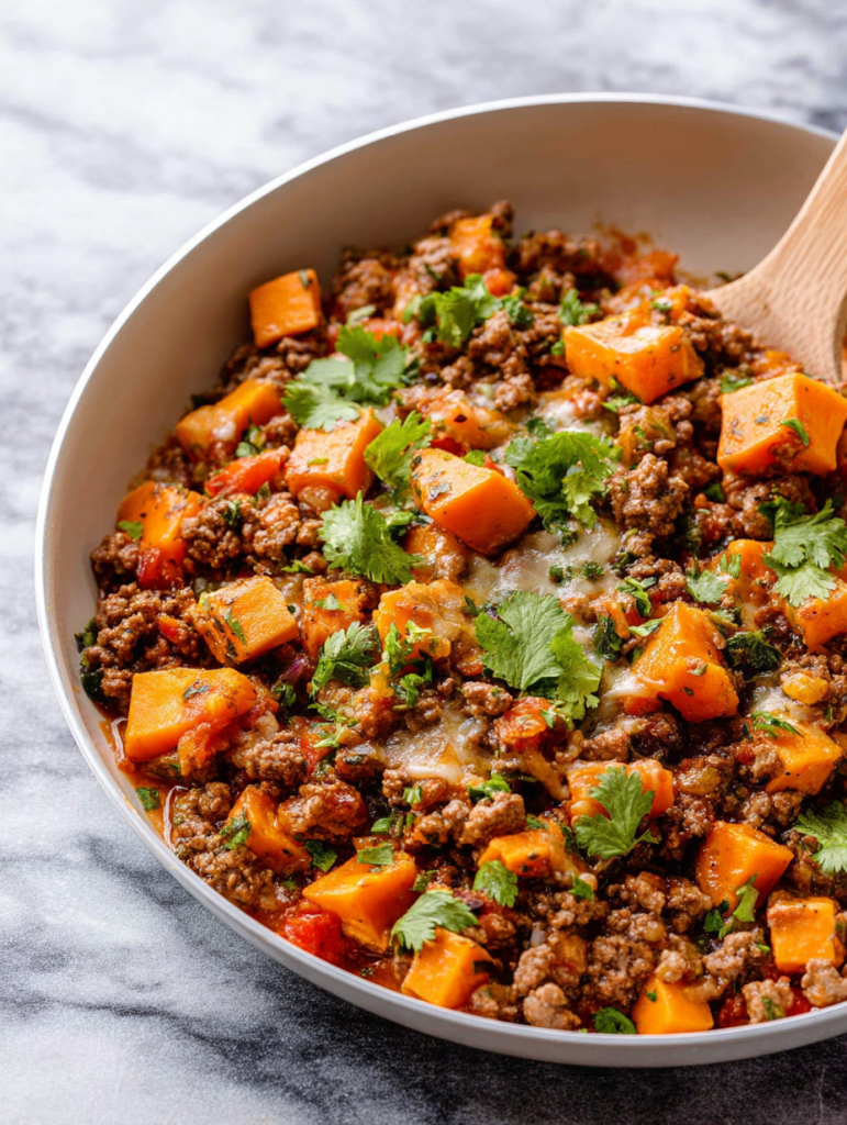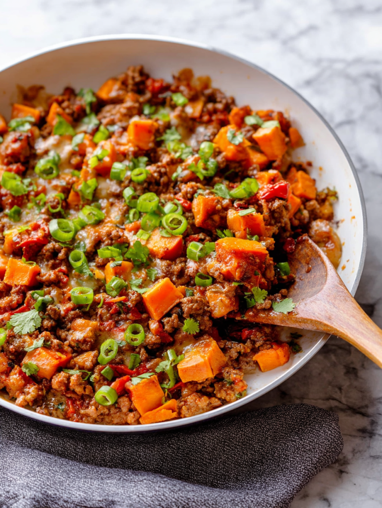Keywords: easy dinner, one-pan meal, healthy dinner, ground beef skillet, sweet potato recipes