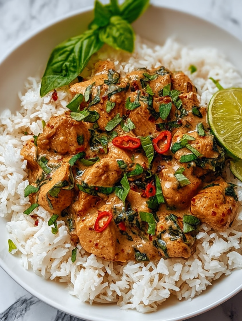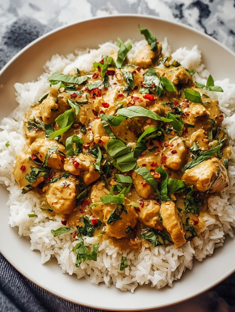 Spoon the coconut chicken over a bed of warm rice. Sprinkle with more basil or red pepper flakes for extra flavor.