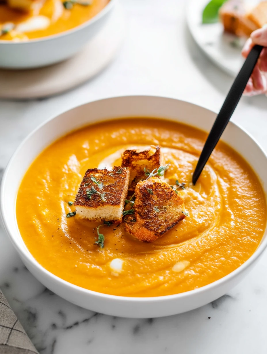 This Spicy Pumpkin Soup with Grilled Cheese Croutons is the cozy, comforting bowl you never knew you needed. Creamy roasted pumpkin blends beautifully with bold spices like smoked paprika and chili, while a hint of garlic and onion deepen the flavor profile. But the real game changer? The buttery, golden-brown grilled cheese croutons floating right on top—melting slightly into the soup for a rich, savory finish.