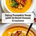 Spice up your dinner table with this creamy and comforting Spicy Pumpkin Soup with Grilled Cheese Croutons. This cozy bowl blends velvety pumpkin puree with warming spices like smoked paprika and chili flakes, then finishes with crunchy, buttery grilled cheese bites on top. It’s the perfect fall comfort food that’s quick to whip up, ideal for easy dinners, and satisfying enough for guests. If you’re craving hearty autumn soup ideas or need a healthy snack or easy dinner recipe that’s both vegetarian and flavor-packed, this is your new go-to.