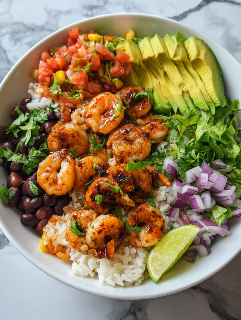 Keywords: easy dinner, shrimp bowl, healthy bowl, spicy shrimp, burrito bowl, dinner ideas, quick meals