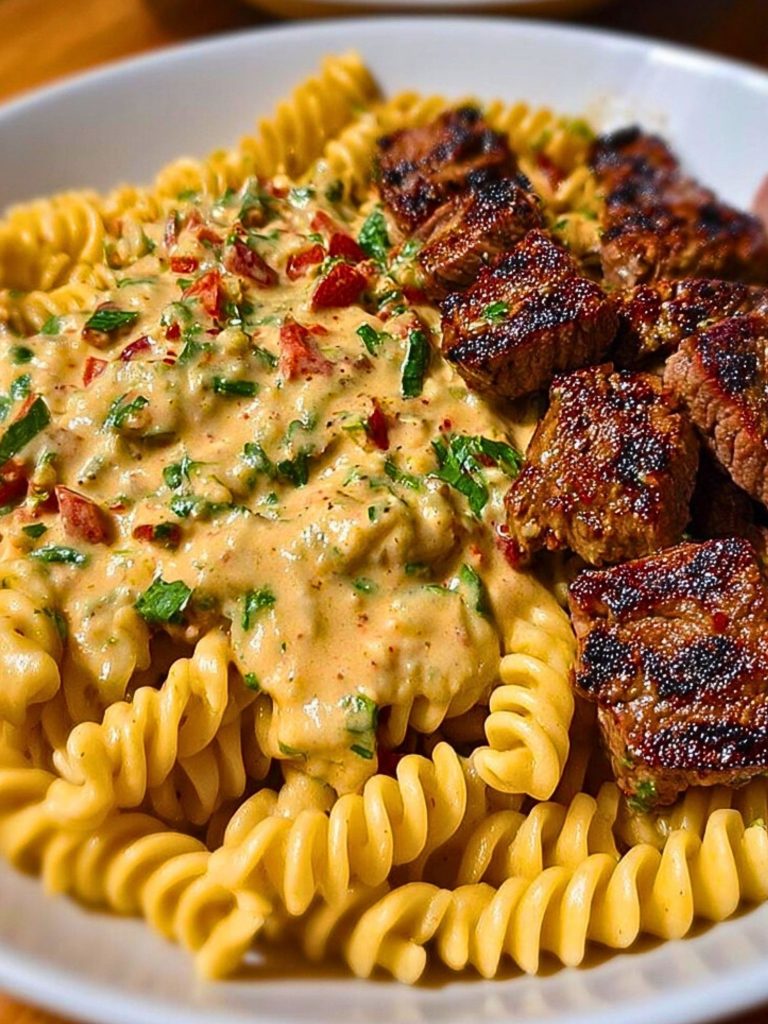 A decadent, restaurant-style pasta dish with juicy steak bites, creamy garlic parmesan sauce, and perfectly al dente rotini. Ideal for cozy dinners or elegant entertaining.