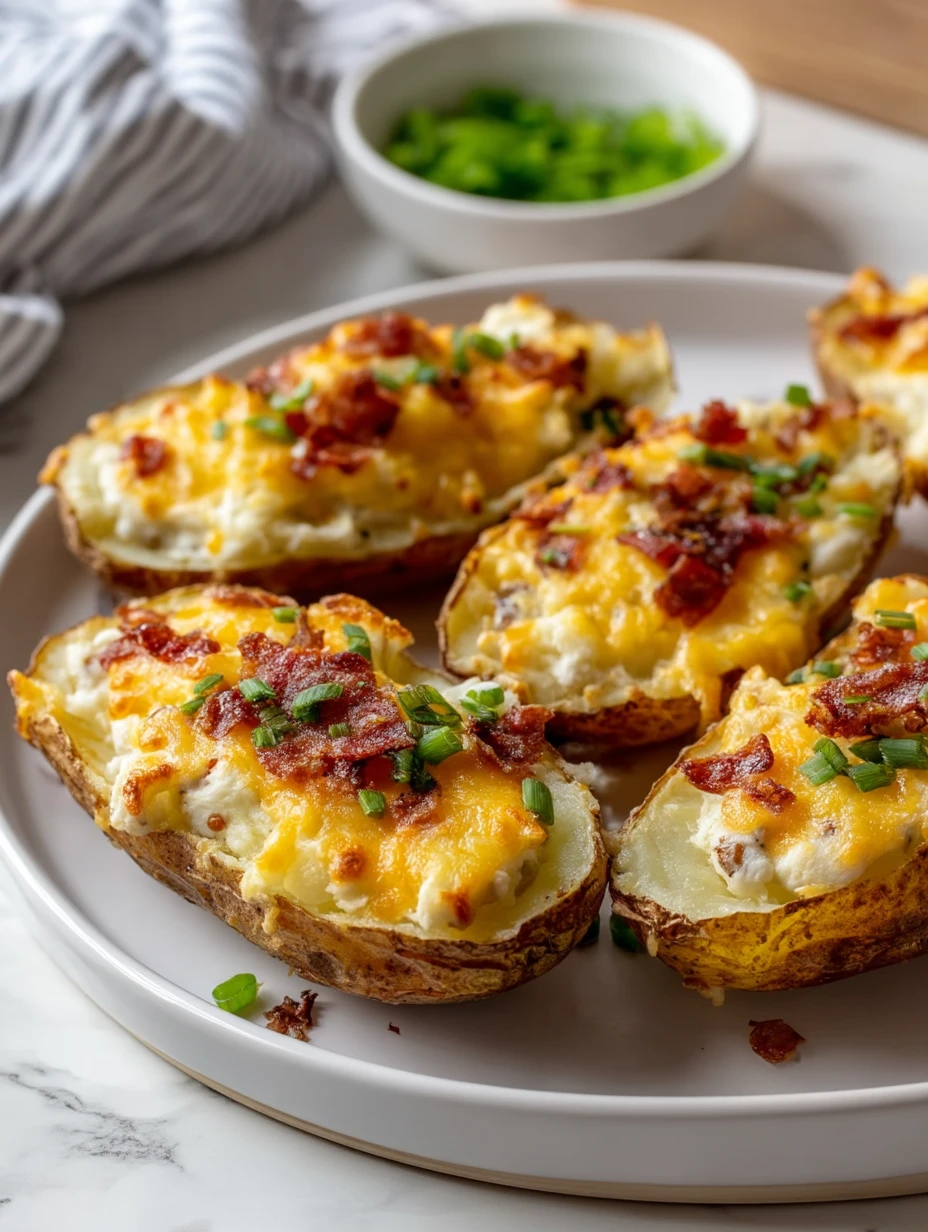 They’re also wonderfully flexible. Keep things classic with cheddar, bacon, and green onions, or swap in your favorite cheeses, add jalapeños for heat, or drizzle with ranch or BBQ sauce. You can even prep everything a day ahead, then just pop the skins in the oven right before serving.