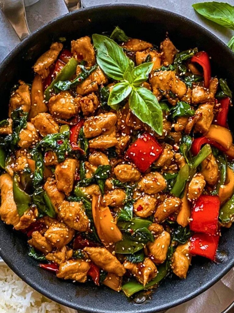 Keywords: quick dinner, Thai basil chicken, spicy stir fry, easy chicken recipe