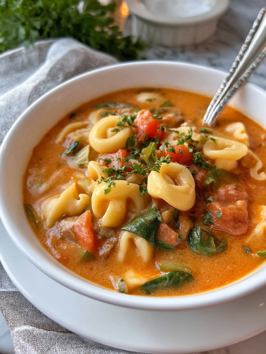 For that cozy, restaurant-style feel, I love using refrigerated cheese tortellini. It cooks quickly right in the broth and releases a bit of starch, naturally thickening the soup so it turns silky and rich.