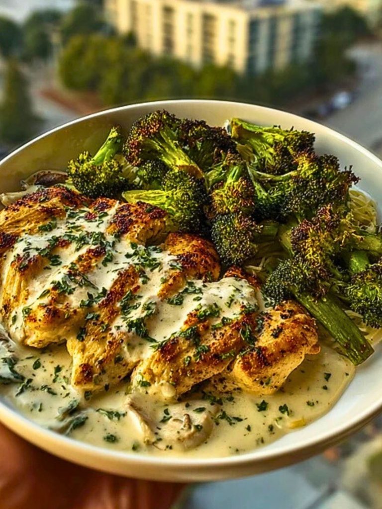 Creamy, comforting, and bursting with Mediterranean flair, this Spinach-Artichoke Greek Chicken Alfredo is the kind of dinner that turns weeknights into something spectacular. It blends the tangy richness of artichoke hearts and spinach with tender Greek-seasoned chicken, all smothered in a luscious mushroom basil cream sauce. Paired with a side of crispy parmesan-dusted broccoli, it offers a complete flavor experience in every bite.