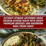 Ultimate Spinach-Artichoke Greek Chicken Alfredo Recipe with Crispy Parmesan Broccoli and Mushroom Basil Cream Sauce