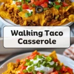 This Walking Taco Casserole turns your favorite party snack into a crave-worthy dinner the whole family will love. Packed with seasoned ground beef, layers of crunchy Fritos, melty cheese, and fresh toppings, it’s an easy recipe that comes together in under 30 minutes. Whether you’re looking for a quick dinner idea, comfort food fix, or potluck winner, this dish delivers bold flavor with minimal effort. Great for easy dinner nights, football parties, or kid-friendly meals!